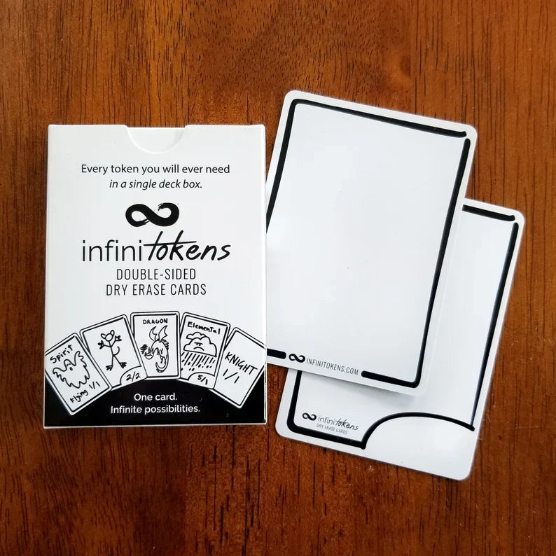 InfiniTokens are customizable, reusable double-sided dry erase cards for trading and collectible card games such as Magic: The Gathering. Carry thousands of token options in one small handful of cards! Being prepared for anything has never been so easy. Can't draw? No problem, just use words.